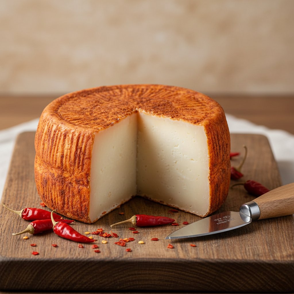 ✨ Caratteristiche Formaggio a pasta dura stagionato dai 12 ai 18 mesi e affinato al peperoncino piccante. La lunga stagionatura sviluppa una consistenza compatta e friabile, mentre il peperoncino dona note piccanti che si fondono armoniosamente con il sapore intenso del formaggio maturo.